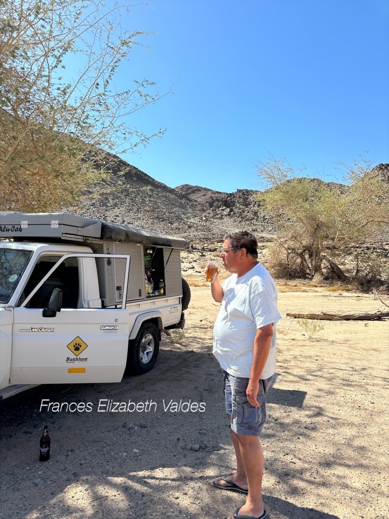 The Ugab seemed gentle and friendly when we got to the bottom of Divorce Pass. The landscape of rocky ravines had turned into sandy river beds, and dark cliffs. We shared a beer at the bottom of the Pass, celebrating having ‘done’ Divorce Pass, and headed off to Rhino Camp.