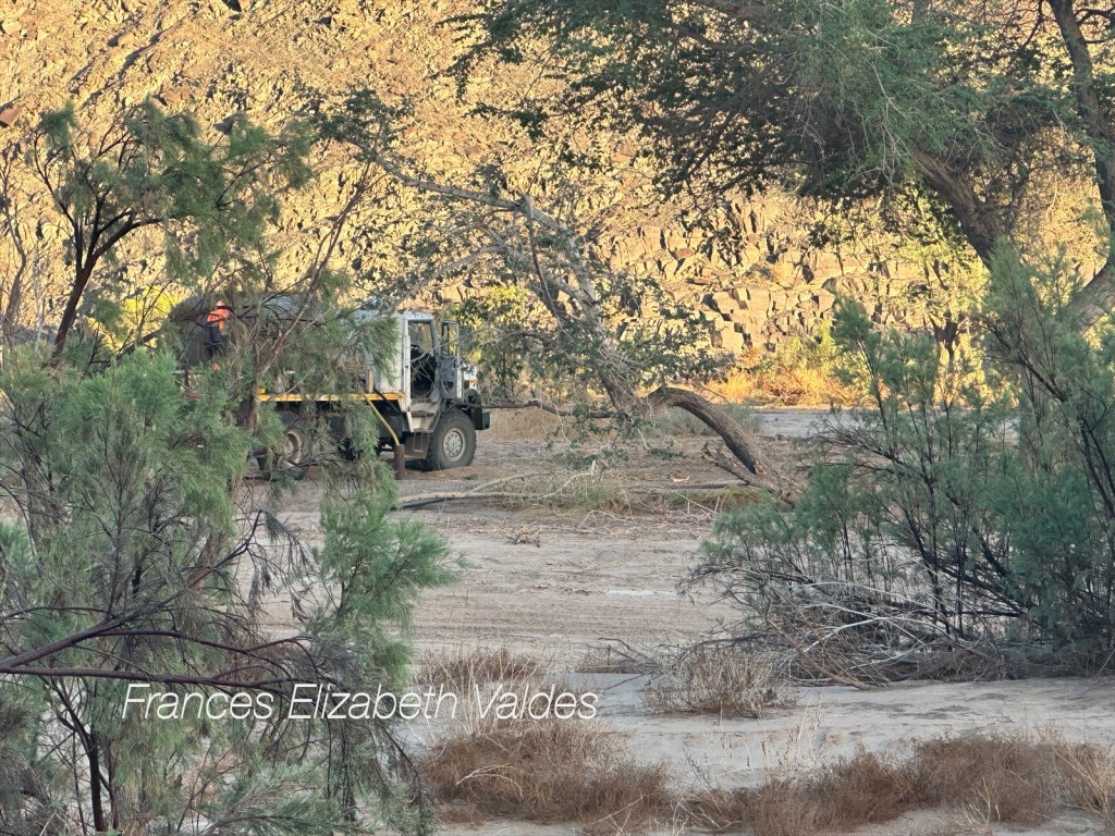 A little later a huge four wheel drive wheel truck pulled up 500 metres away, and started drawing water from a borehole. Mining is very demanding of water, and they are taking the water which the animals, Louise and the camp need