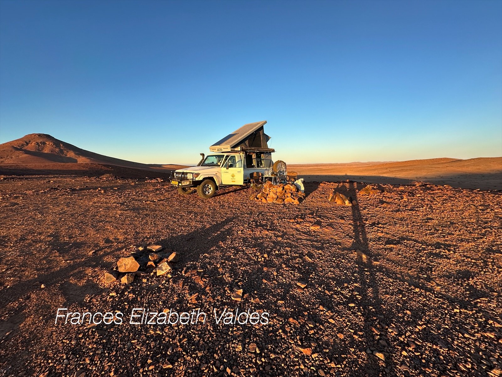 We made camp down the Mudorib Valley, a tributary (if you can call it that when both ‘rivers’ are ephemeral) of the Hoanib, and a little way from the President’s Waterhole,. It was an area we had camped in before, and I’d loved it. In 2020 I had been showering outside the land cruiser when a giraffe walked by. I found it incredible that there I was, soaping up, and a large animal should saunter by.