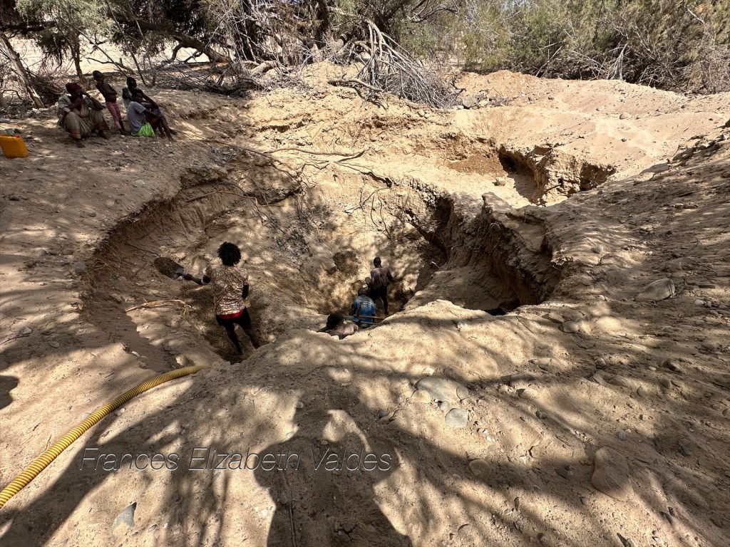 It was early when we were in camp, and unusually for us we spent the afternoon chilling out. It was really rather nice, we were overlooking the dry river bed, with a view of the distant mountains. The campsite was in a lovely situation. We were curious about how the borehole dig was going and went to see. By the end of the day the water table had been reached, and Chips looked so happy.