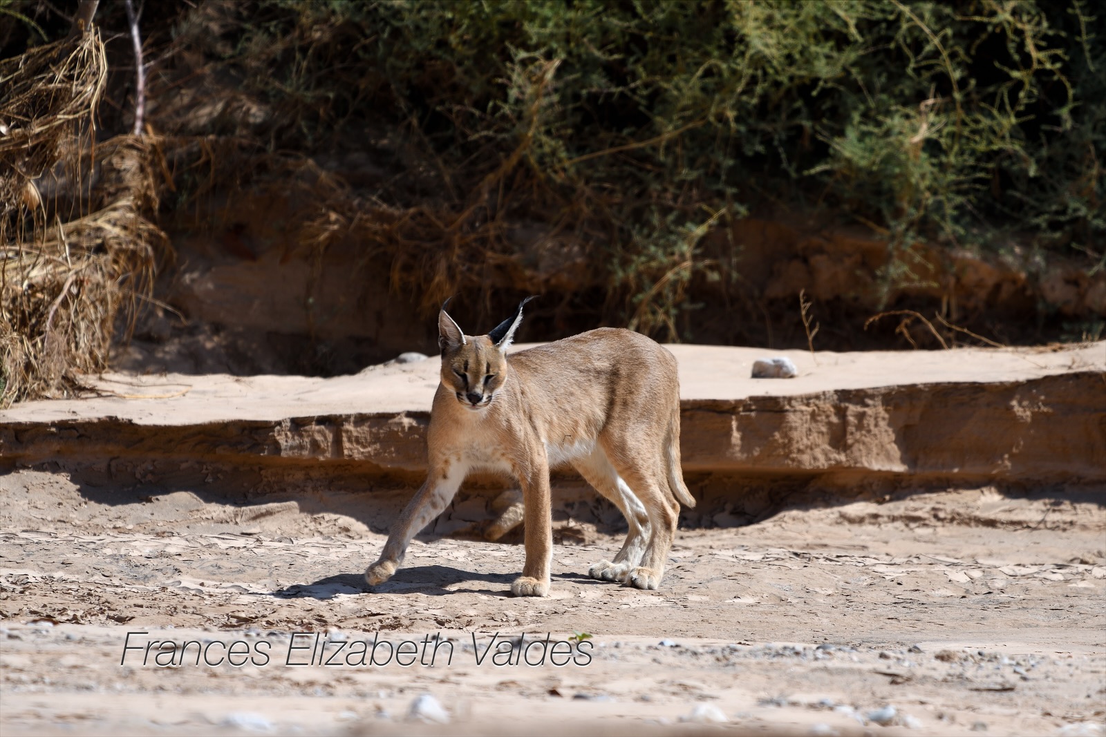 As we were talking to them he shushed us, and pointed. There was a caracal cat opposite, heading towards a small pool of water.