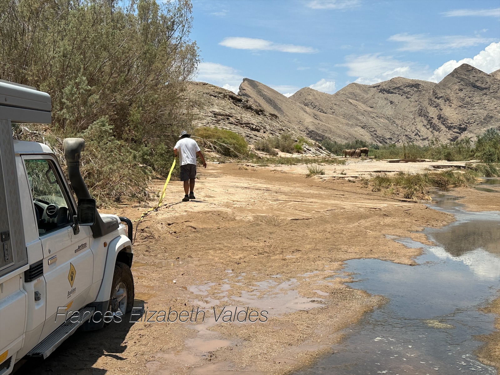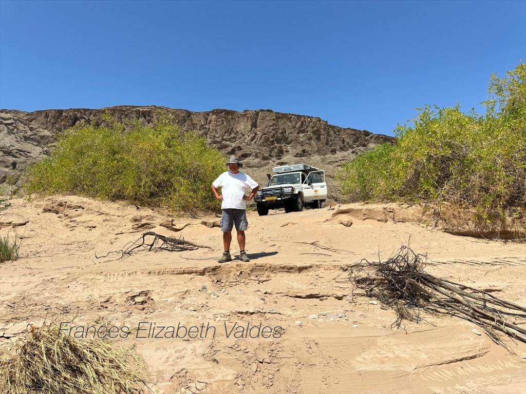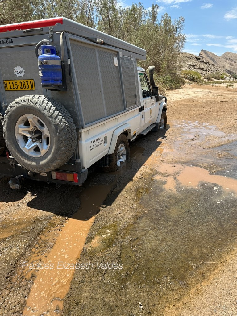 By this time, the ellie’s had moved on, and it took us a while to find them. Over the years Nigel’s four-wheel driving skills have got better and better. This trip they have been fantastic, he’s driven up sand dunes, down steep inclines and over rocky river beds. BUT….as a paragliding instructor friend says, if you keep pushing boundaries you get to one that can’t be pushed.