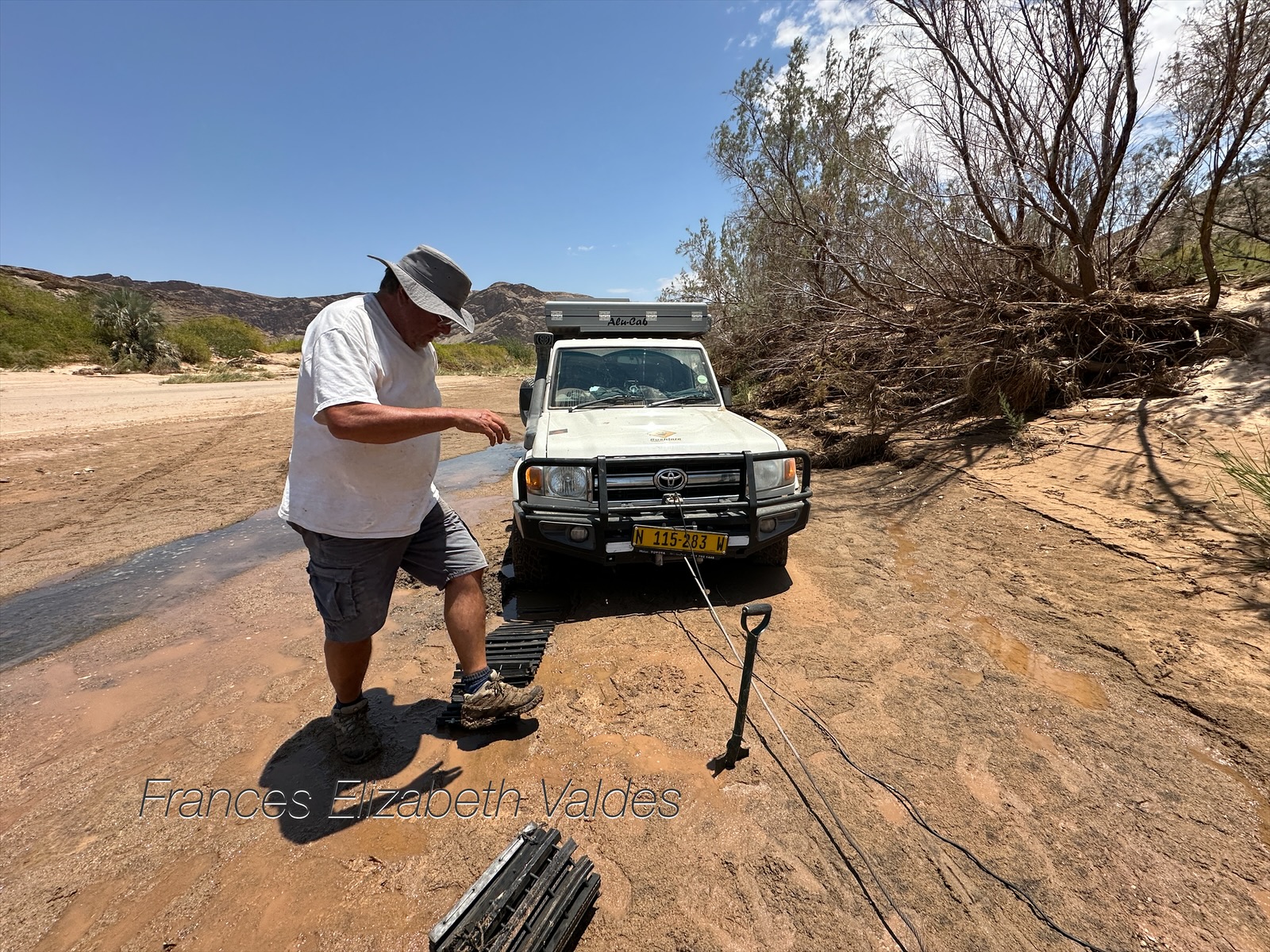 It was such a small innocuous little stream, on the bottom of a wide sandy river bed we had been driving on. We drove across the stream, and got stuck. Initially I wasn’t worried because Nigel has got us out of these little situations without much problem in the past. However, this time he tried all his usual techniques, but nothing worked. Instead we were getting deeper into the mud.