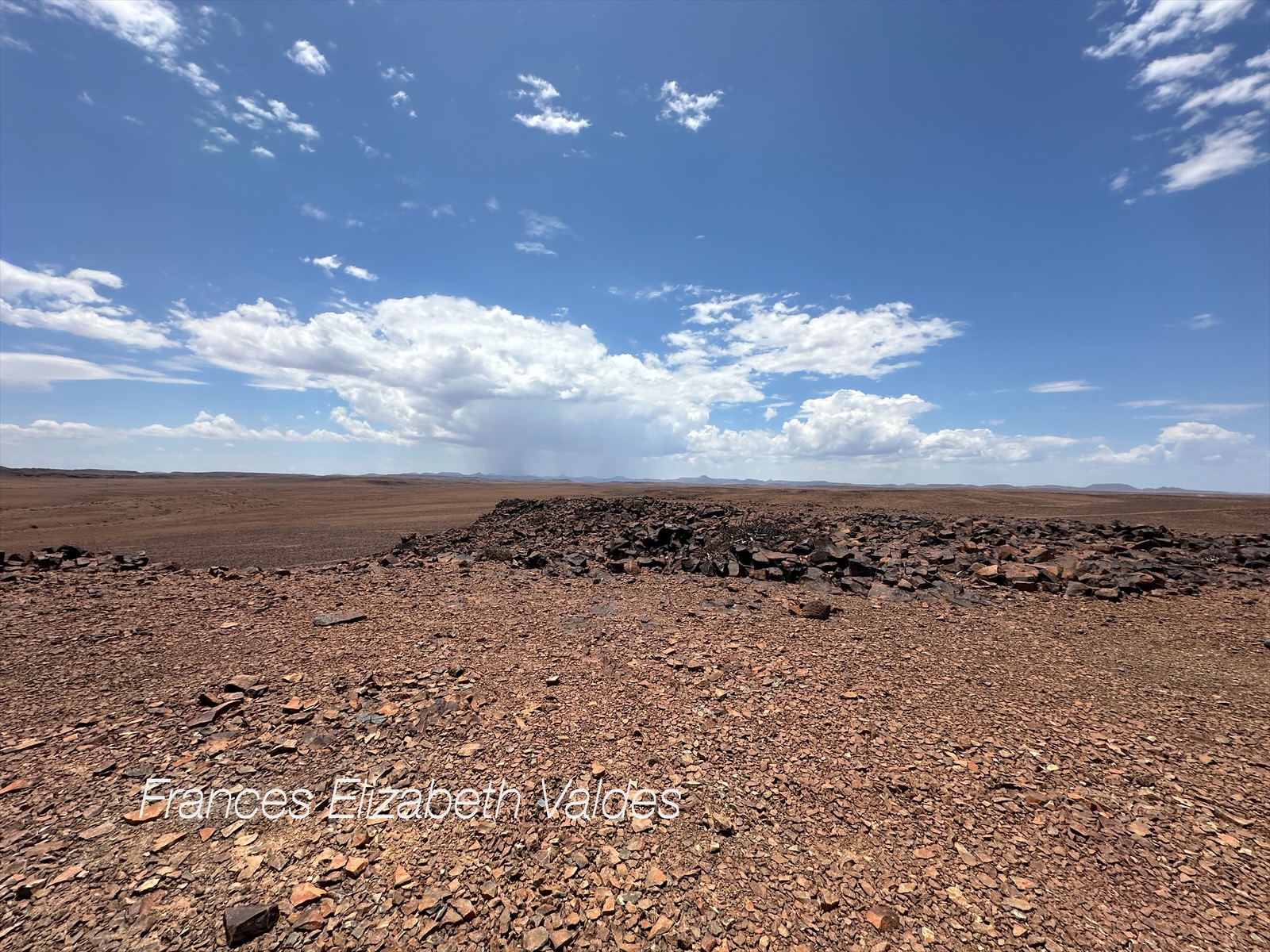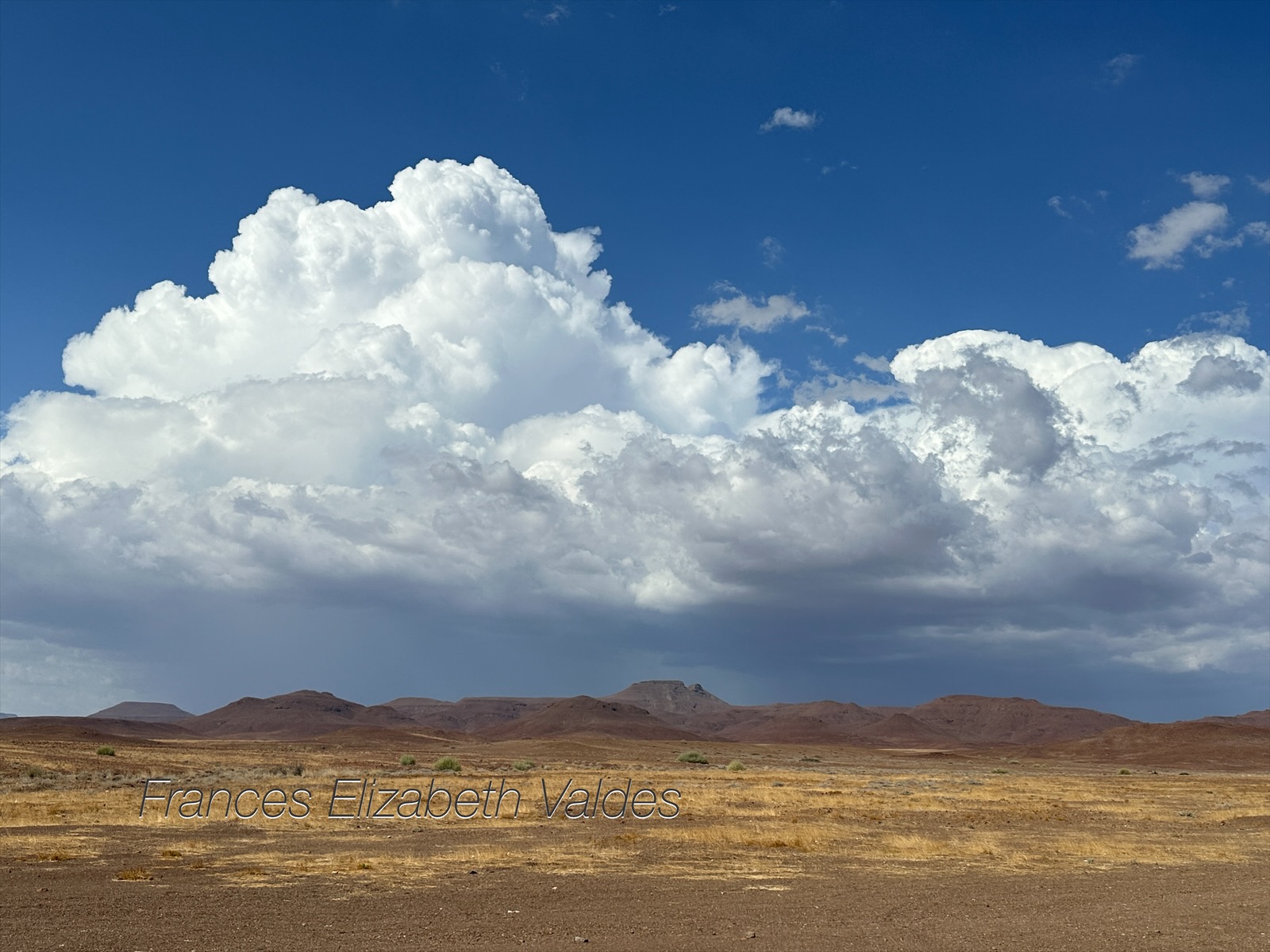 Crowthers camp was on a hill like Black Ridge. The view was amazing, possibly better than Black Ridge. We could see right over to the Etendeka mountain, I think – scale is impossible. It was very hot. Over the distant mountains large cumulus clouds were developing. Perhaps they would get needed rain, but it was a long way way from where we were – or so we thought!