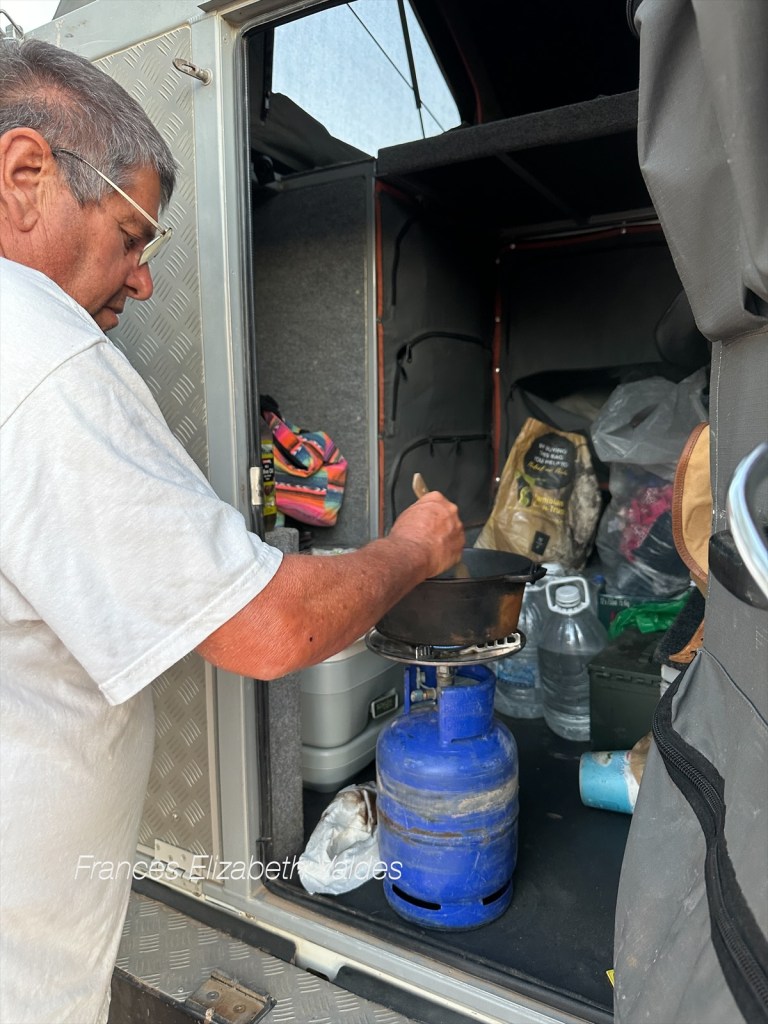 The wind was so strong that evening, Nigel ended up cooking in the doorway of the campervan. I remembered the burnt campervan we had seen in the Palmweb Concession a couple of days ago.