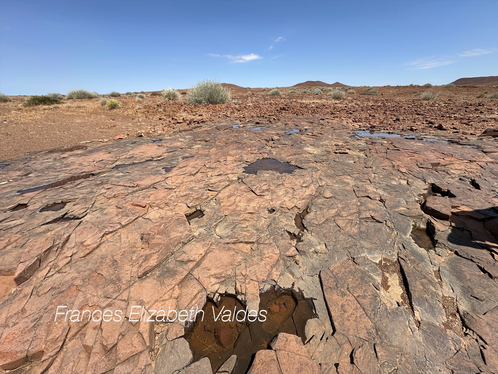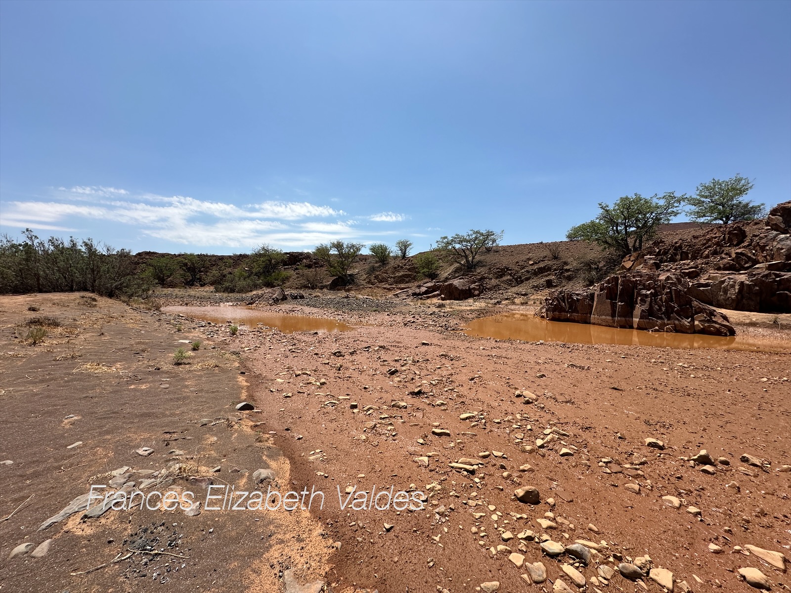 We had lunch at a river bed which had been dry when we first entered the Concession area on our way to the Hoanib. It now had water in it. Just before we got to the Palmweg Day Concession area, we met a bakkie full of rhino rangers and one policeman with a very large rifle. They were off looking for rhino, and any signs of poachers. The policemen often accompany the rhino rangers.
