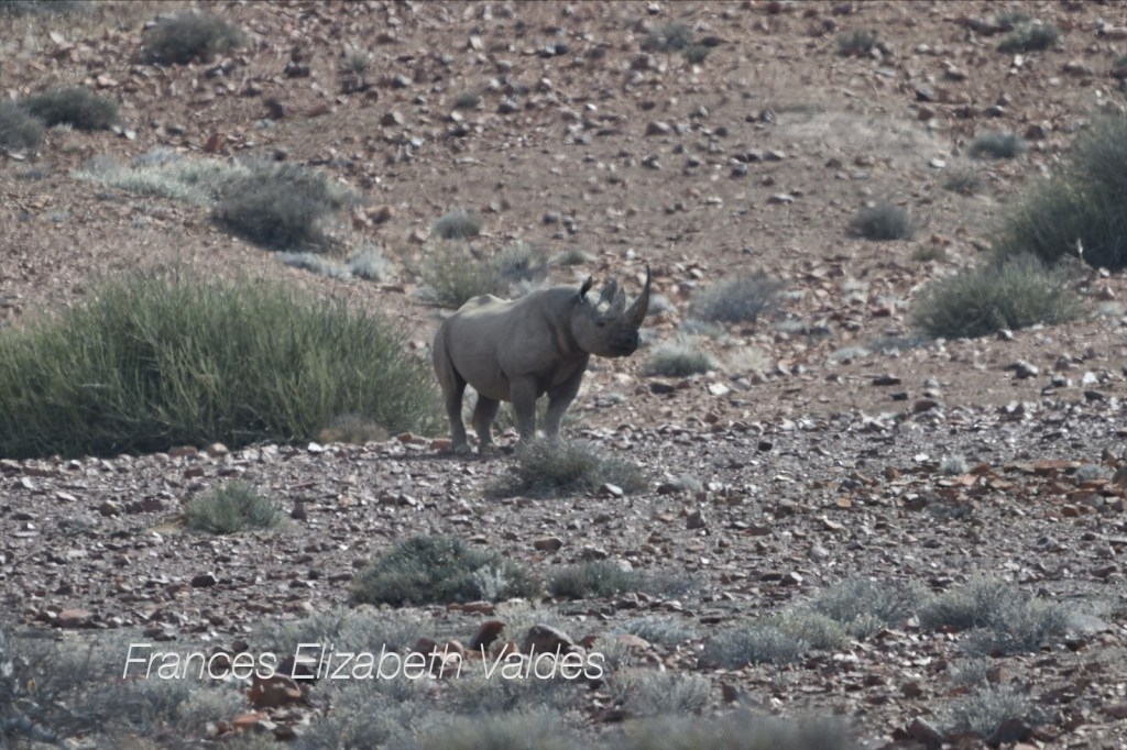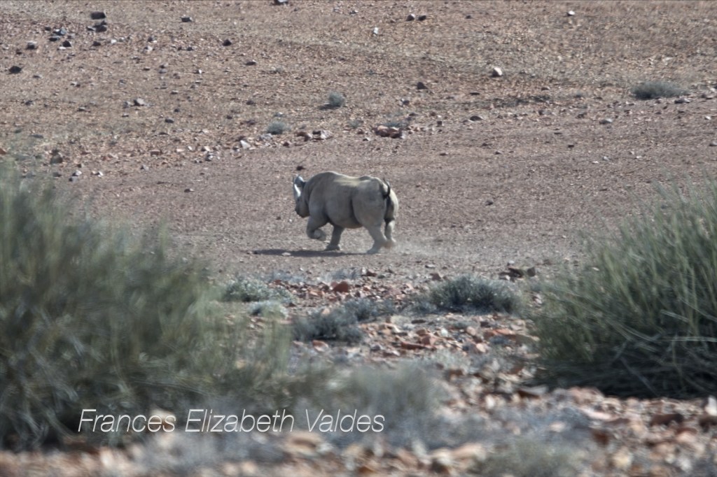 We continued our drive towards the Skeleton Coast – Bersig Road. It was slow going as the track was littered with small stones. As always in Africa, just as I was beginning to think the scenery unchanging and a bit boring, things changed. Suddenly, on the side of the track, up a small hill, I spotted a rhino. This was incredible. We have seen rhino at a waterhole in Etosha, but finding one when you (and it) are all alone in the wilderness, is a lot different from seeing one in a national park.