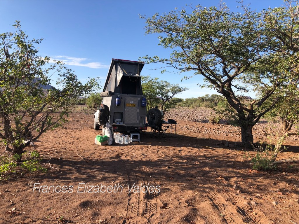 We went off to the ex-campsite and set up. It was just as beautiful as before, but the fire pits had fallen into disrepair, and there was no water at all. It was surrounded by mopani trees which looked very green. In fact, we had thought how green things looked when we got on to the Springwasser Gate road. It wasn’t as if the ‘rainy’ season had brought them much respite from the drought, but clearly there had been a bit of rain.