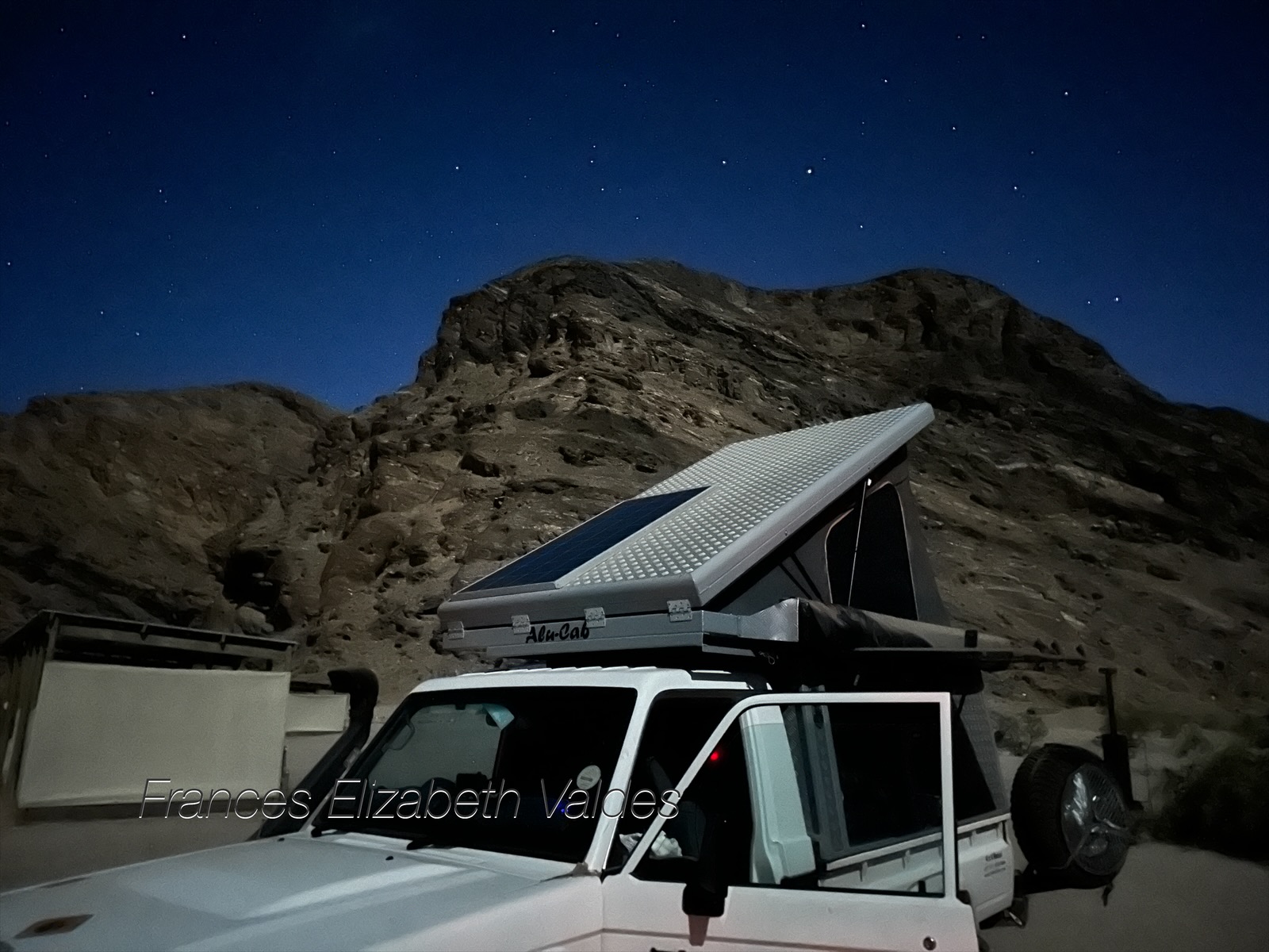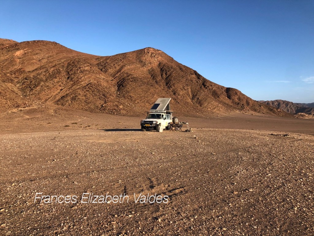 We watched a 4-wheel drive camper drive through the concession gates in the distance, followed by a small 4-wheel drive urban car. This was the great thing about our pitch, the view it gave us of, what little comings and going there were. The two vehicles disappeared west down the Hoanib river. We were fully convinced that the smaller of the cars would not be able to manage. But it did, and we saw them both come back and drive up to the campsite. People in this part of the world are generally camping because they want to be by themselves, so they went to the opposite end of the campsite to us – which was a relief!