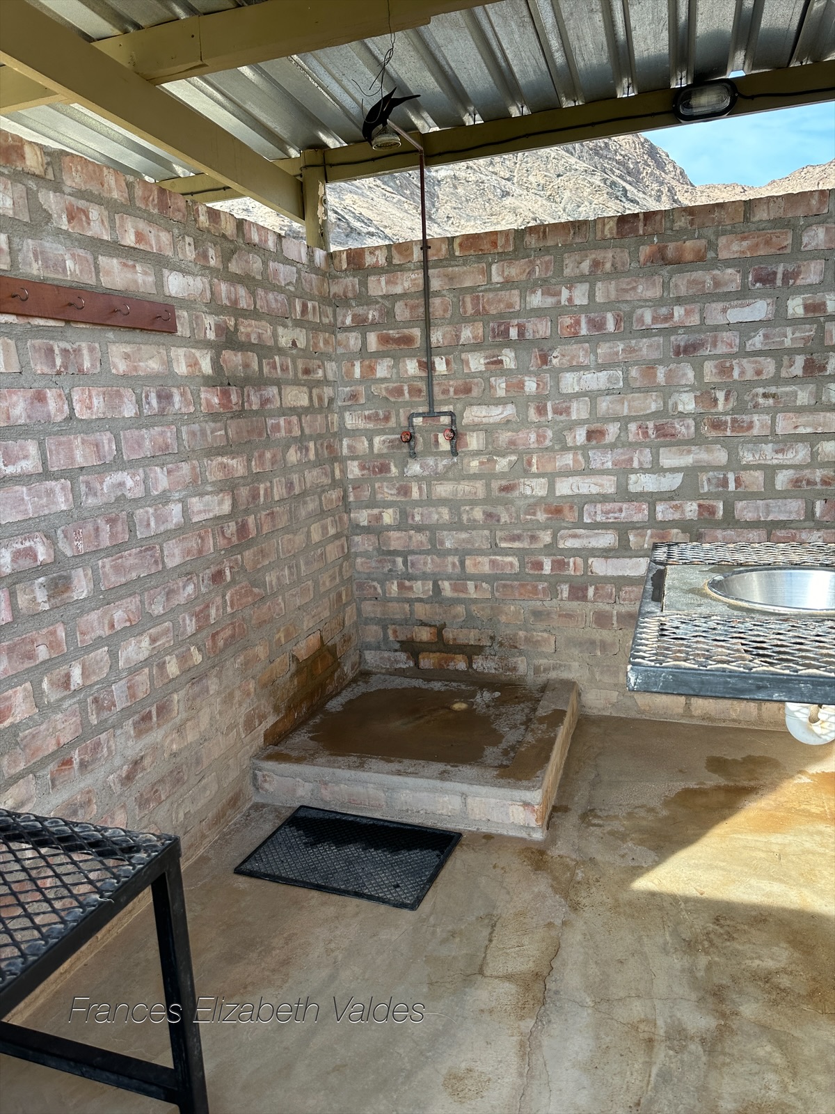 Our favourite pitch at Elephant Song (top), and the extremely welcome shower (right). If you look closely, one of the marauding starlings is trying to drink from drips off the shower head. Our land cruiser had a shower attachment on the outside, and we had a shower every night, but we had to be frugal with the water. Having said that, the drought in Namibia meant we didn’t feel it was right to stand on Elephant Song’s shower for long.