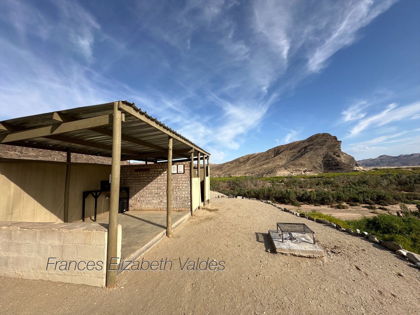 The shade in the campsite was very welcome in the heat of the afternoon. There were only half a dozen pitches, all with lovely open air showers, toilets, and kitchen sink area. There was a fire pit, which proved a little useless in the relentless wind. We sat, sheltering from the wind in the kitchen patio, and looking out to a wonderful view of the Okambonde Plains and the surrounding mountains.