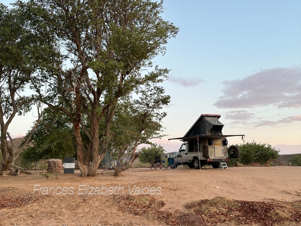 It turned out that the Aba-Huab Community Camp was lovely, but so hot. We had a wonderful shower which temporarily cooled us. The shower head was in the middle of a large tree around which the shower had been built. There was a huge, very beautiful Hawk Moth on its trunk. I do take my camera everywhere, but not the shower, so you will have to take my word for it.