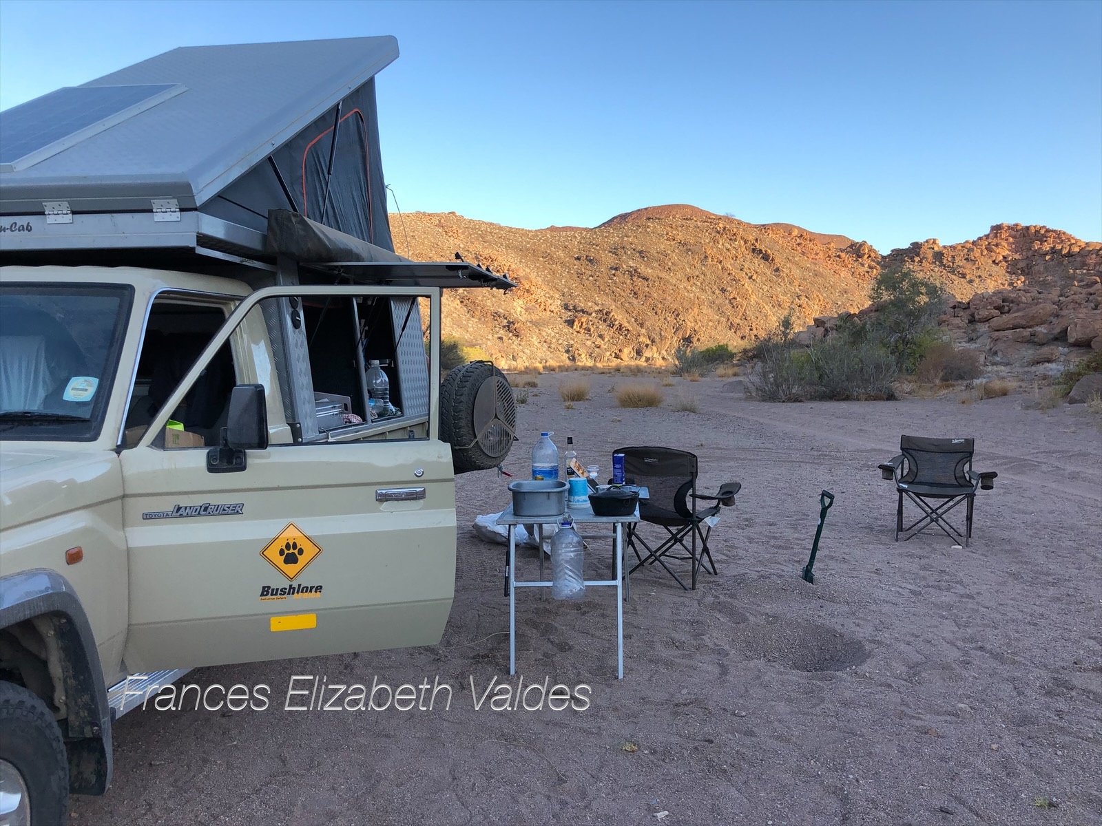 We were the only people in Rhino camp but despite that, we wanted greater remoteness and wild camping – just us and the desert. In the past, we found this kind of remoteness in the Doros !Nawas Conservancy, our next stop ( the local language is Nama which is click based hence the ‘!’ ). We filled our water tanks before we left Rhino Camp in anticipation of at least a couple of nights wild camping.