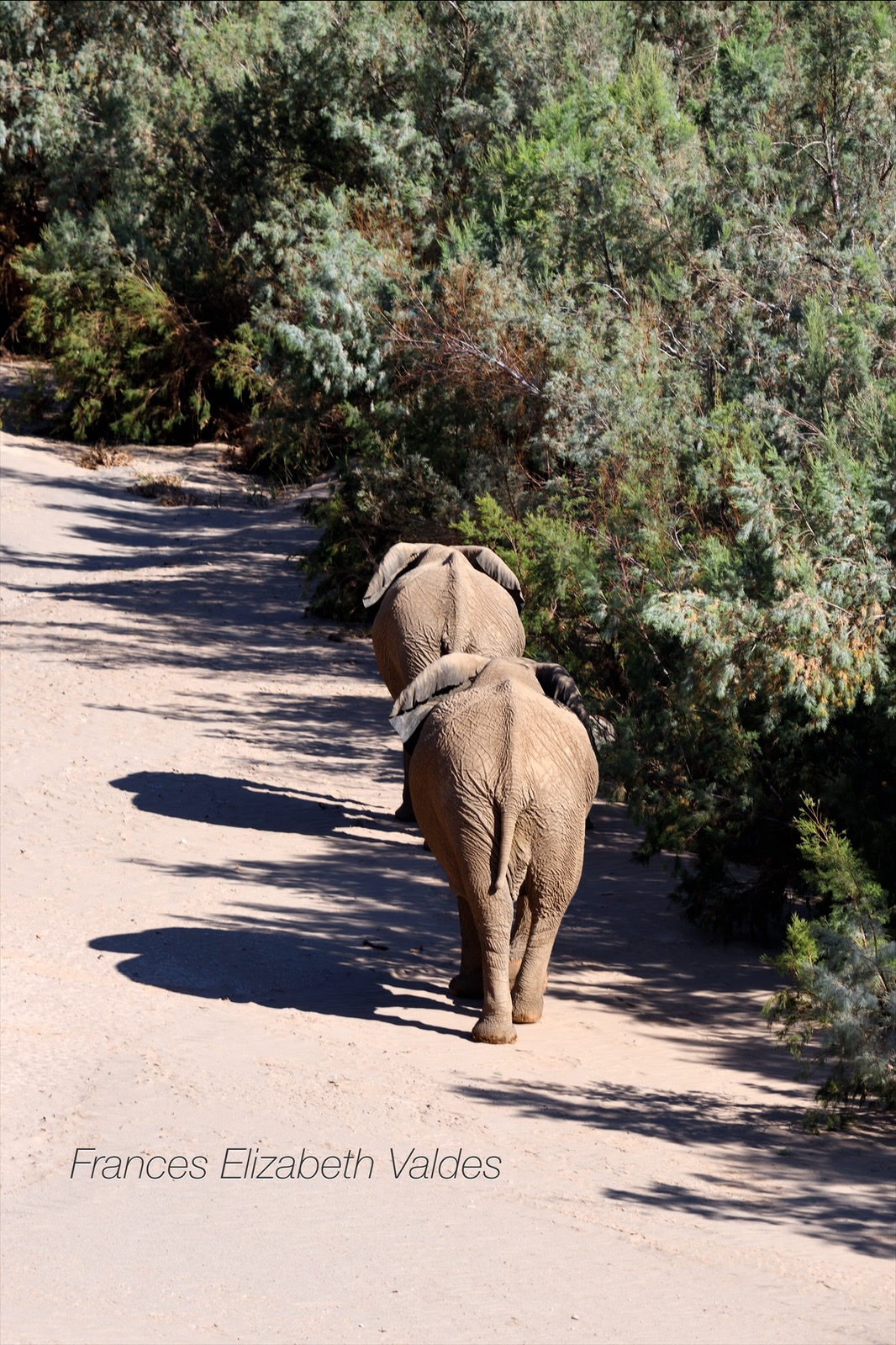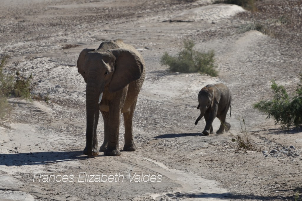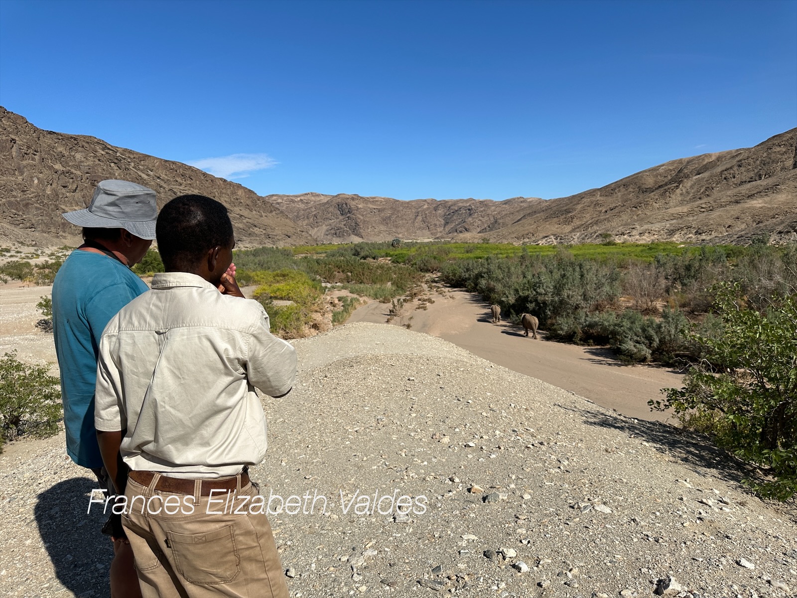 We were just about to pack up to go to Sesfontein when Magnus pointed out the elephant family was returning. They were in the river bed immediately below the ridge where the campsite is. Slowly they meandered down the river bed and towards the west end of the Hoanib.