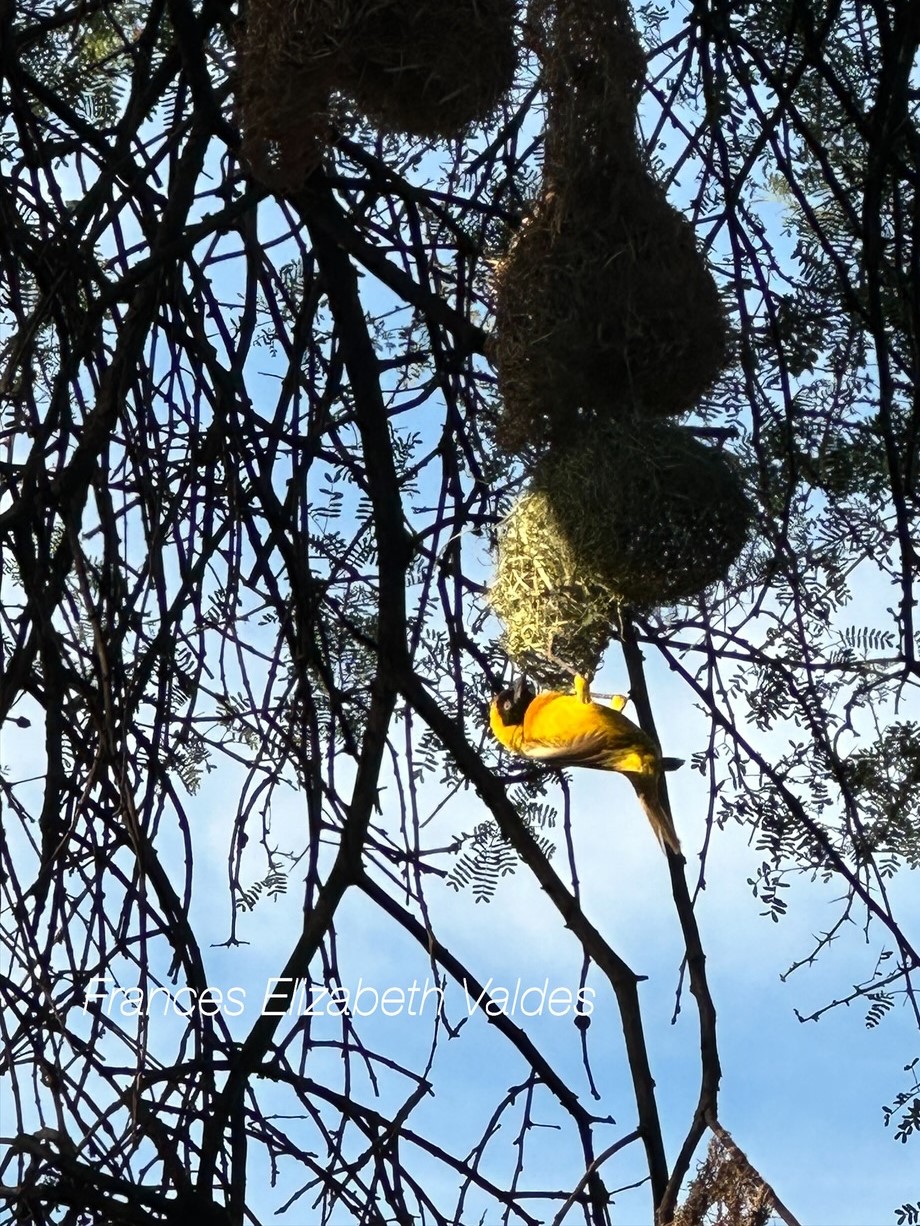 We sat down for breakfast and realised the weaverbirds had chosen the tree for the same reason we chose our table – access to food. Anyone leaving their table to get a knife or more coffee, returned to the remains of a weaverbird raid.